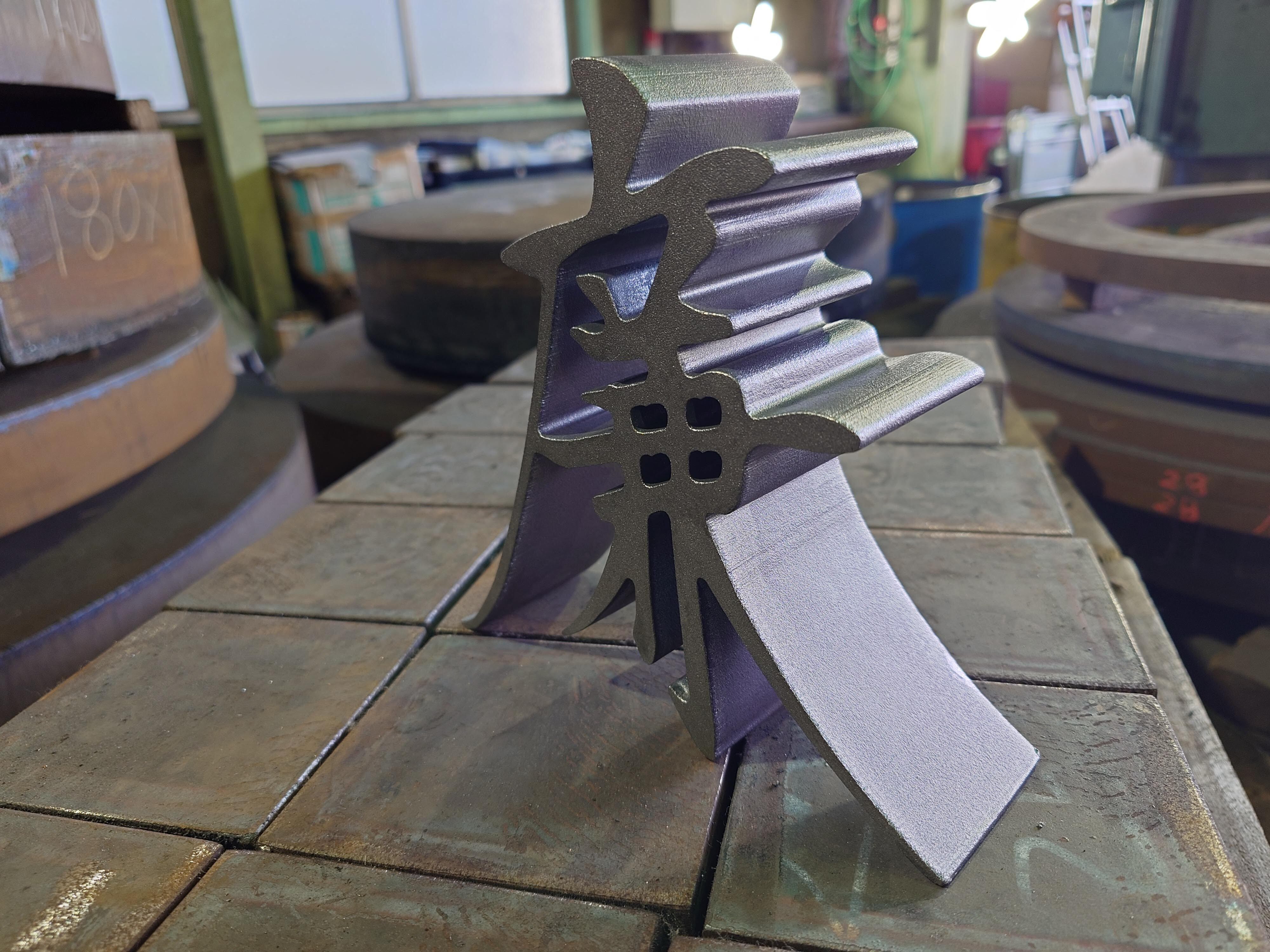 鉄板から炎で切り抜いたあとは、表面の酸化した皮膜をショットブラストで取り除き、簡易的な錆止めとしてクリアラッカーを施しています。番組内で紹介していただいたあと、一度こちらで預かって同様の処理をしたものを永瀬さんにもお送りさせていただきました。